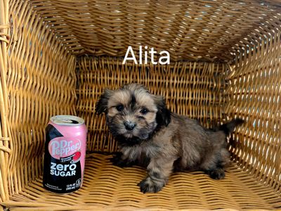 Description: Alita is a dynamite brown and black female teddy bear puppy for sale in Wisconsin! She has very nice boxy features and her coat is very soft and thick. She loves kids and other dogs and is well socialized! Nice size at around 10 lbs full grown!