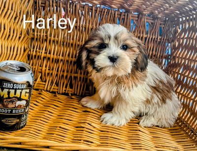 Description: Harley is a perfect tri color male teddy bear puppy for sale in Wisconsin! He has very nice boxy teddy bear features and very pretty tri color markings. He is great with kids and other animals! they don't come cuter than this little guy! Around 10 lbs full grown!